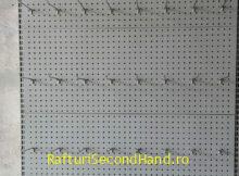 Rafturile prezentate sunt rafturi metalice noi de supermarket dotate cu panouri metalice pe care se prind agatatori – carlige pentru expunerea marfii . Fiecare modul de raft cuprinde